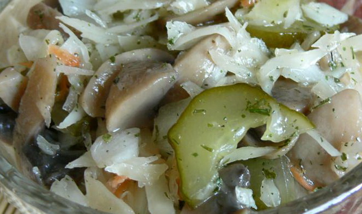 Faire bouillir les pommes de terre dans leur peau, les peler et les couper en tranches. Hacher finement les champignons marinés, trier la choucroute, égoutter la saumure en excès. Mélanger les légumes avec les champignons, ajouter les oignons finement hachés, verser l'huile et le vinaigre, saupoudrer de sel, poivre et bien mélanger. Décorer le plat avec des tranches de cornichons, des petits chapeaux de champignons, de l'aneth et du persil finement hachés.