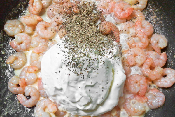 4. Les champignons et les oignons se combinent avec les crevettes et la crème sure, le sel, le poivre, mélangez bien.