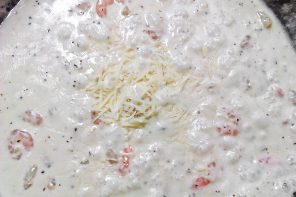 3. Faites frire ces ingrédients à feu moyen.en remuant constamment. Transférer dans un bol et mélanger avec les crevettes, la chapelure et le fromage râpé. Assaisonner avec du sel et du poivre au goût.
