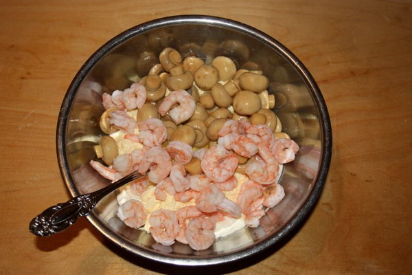 Selon cette recette, préparez une salade aux crevettes et aux champignons comme ceci: