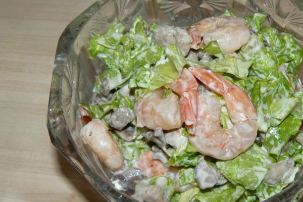 5. Prenez un grand plat et recouvrez-le de laitue, au milieu, une lame de crevette aux bords - une salade de champignons tout prête.
