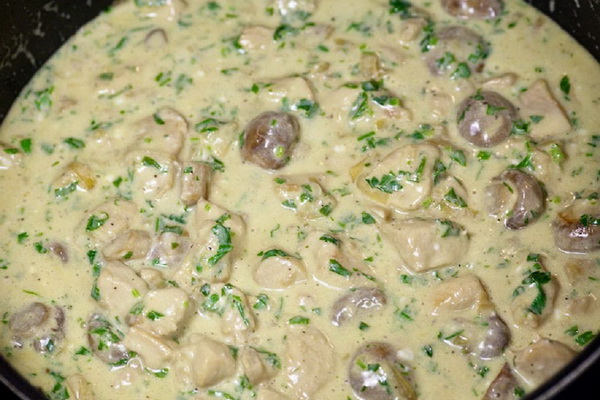 5. Mettez les champignons dans une poêle, faites les cuire de tous les côtés pendant plusieurs minutes, puis versez-les avec de la crème. Ajouter les fruits de mer aux champignons et laisser mijoter tous les ingrédients pendant 3 minutes.