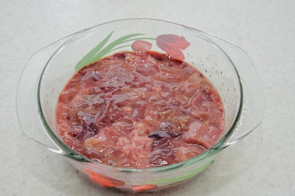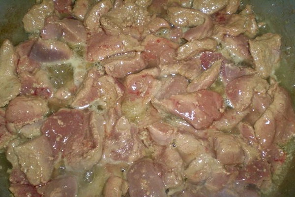 3. Nettoyez le foie des films, rincez-les, coupez-les en petits cubes et faire frire à feu vif. Le foie ne doit pas être frit, il est souhaitable qu'il conserve une couleur rose, il est donc déconseillé de le conserver longtemps dans une casserole. Ajoutez le miel et l'eau-de-vie au foie, mélangez bien, attendez que l'eau-de-vie se soit complètement évaporée et retirez-la du feu.