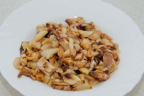 4. Mettez les champignons coupés dans une casserole. avec de l'huile végétale et faire frire jusqu'à ce que le liquide s'évapore complètement.