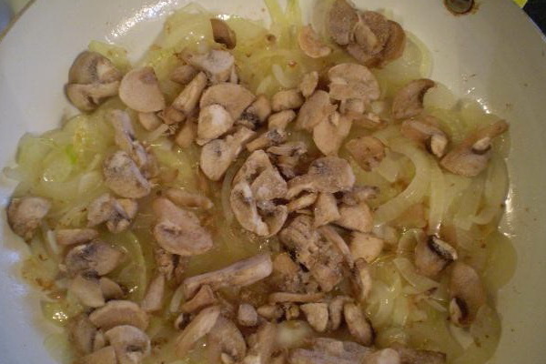 3. Faire revenir l'oignon avec l'ail dans une poêle avec de l'huile végétale pendant deux minutes. Ajouter les champignons et les faire frire pendant 7 minutes supplémentaires.