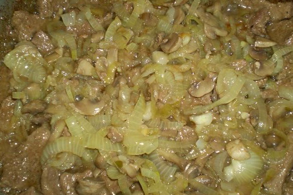 8. Remettez le foie de la plaque dans la casserolemélanger avec les oignons et les champignons, bien réchauffer, ajouter toutes les épices à ces composants.