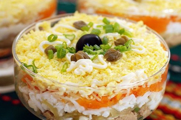 Étalez une salade en couches avec du foie de poulet et des champignons dans l’ordre suivant: