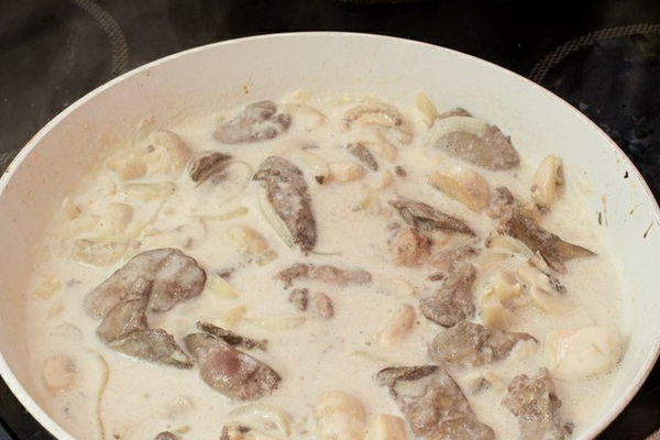 6. Ajouter le foie de pouletLaisser mijoter sous un couvercle fermé, en remuant de temps en temps, pas plus de 5 minutes. Ajoutez un murmure de sel et de poivre, mélangez et retirez du feu.