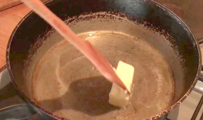 - Couper en tranches, verser dans une casserole avec du beurre fondu.