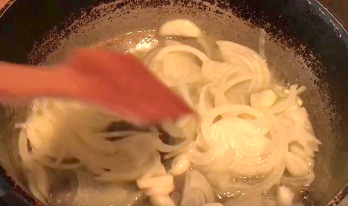 - Pelez l'oignon de la couche supérieure, coupez-les en fines rondelles et faites-les revenir au beurre jusqu'à ce qu'ils soient dorés.