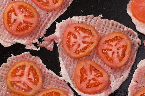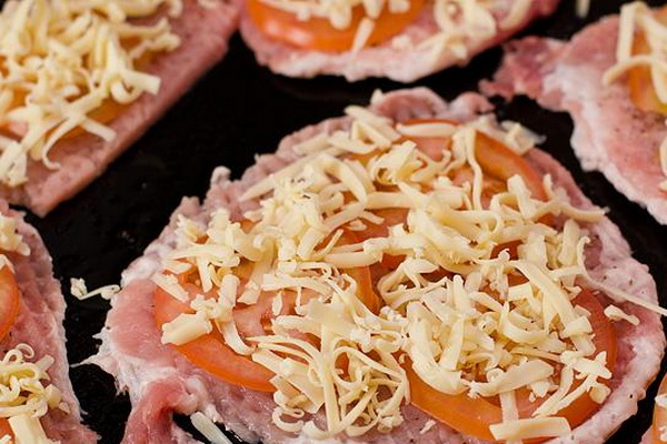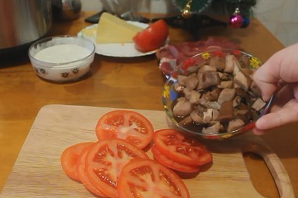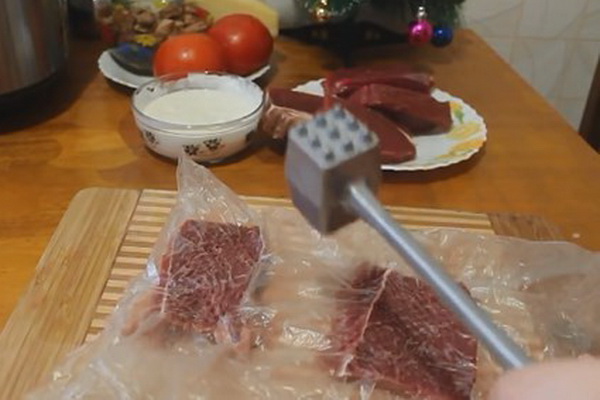 Couper la viande en portions, battre à travers le film jusqu'à une épaisseur de 0,5 cm.Couper les tomates en cercles d'épaisseur égale à 1 cm. Couper les champignons en 4 parties.
