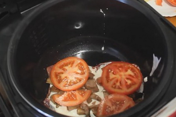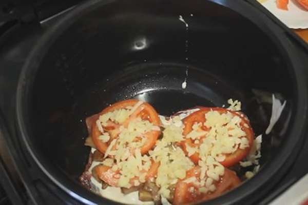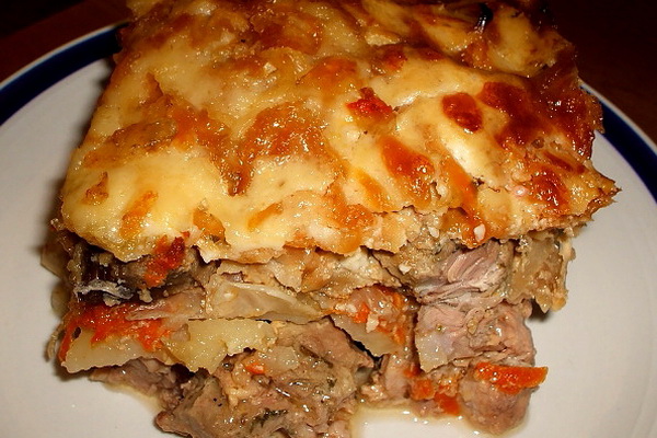 Tout d'abord, déposez la viande et saupoudrez-la d'épices. Ensuite, mettez les champignons, graissez-les avec une petite quantité d'un mélange de crème sure et de mayonnaise, puis mettez les tomates et versez-y du fromage râpé. Continuez à disposer les couches dans cette séquence jusqu'à épuisement des ingrédients.