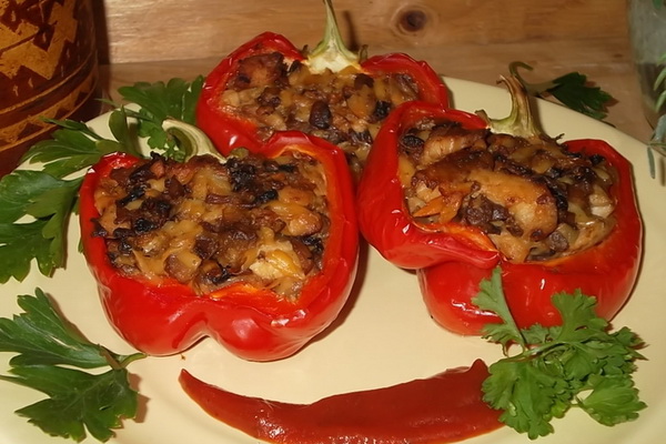 Pour une variété et une décoration spectaculaire de n'importe quelle table, tous les mêmes ingrédients peuvent être utilisés pour préparer un plat copieux et savoureux - poivrons farcis à la viande et aux champignons.