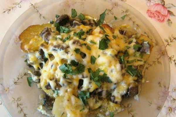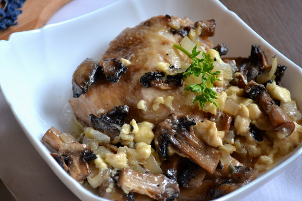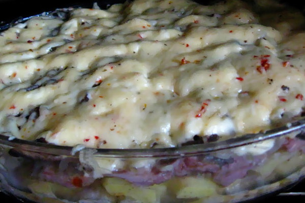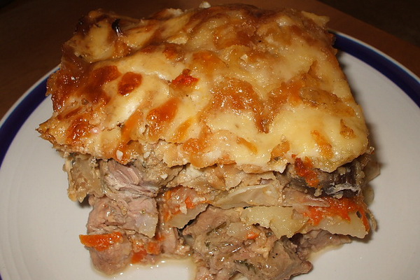 - Viande cuite au four avec champignons, fromage et crème sure