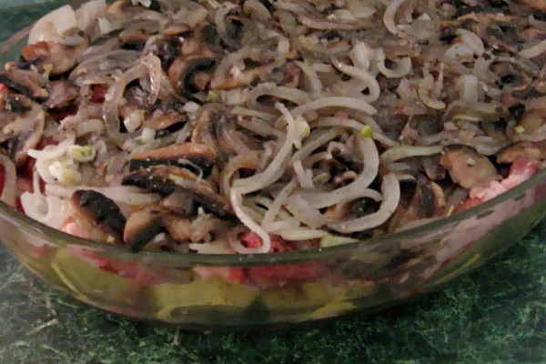 Dans une forme profonde, graissé avec du beurre, mettez la viande hachée avec des champignons, de la purée de pommes de terre. Mettez le moule pendant 45 minutes dans un four chauffé à 200 ° C.