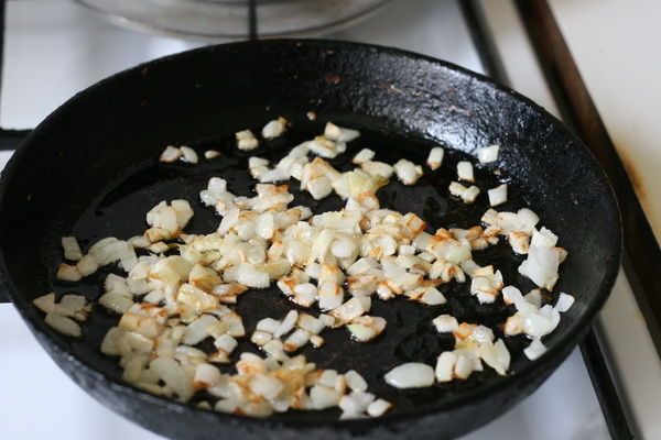 2. Pelez les oignons, laver à l'eau courante, hacher, faire frire jusqu'à coloration dorée dans l'huile de tournesol