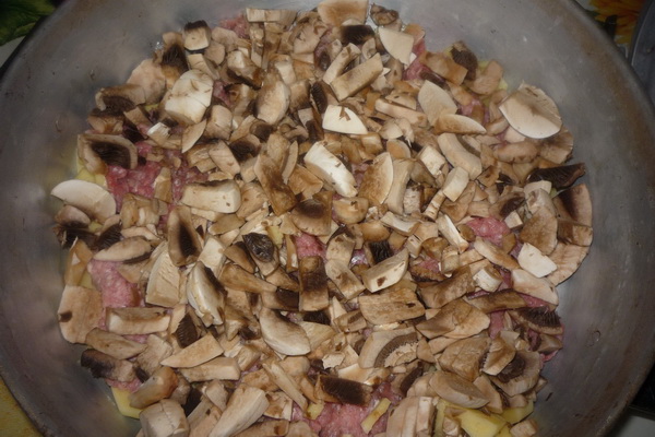 4. champignons doux à attraper de l'eau avec une cuillère à égoutter, coupé en lanières et envoyé dans le pot pour la viande;