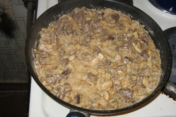 9. 5-7 minutes avant la cuisson, ajoutez 150 ml de crème sure dans la casserole et une cuillère à soupe de farine, diluée dans de l'eau pour donner au plat une consistance visqueuse;