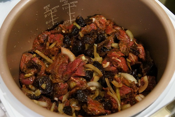 5. Dans le mode "Friture", préparez un mélange de viande, champignons et oignons dans l'huile végétale jusqu'à la teinte dorée claire. Après cela, versez de l'eau dans le bol multicuiseur et laissez cuire au moins une heure en mode "Extinction".
