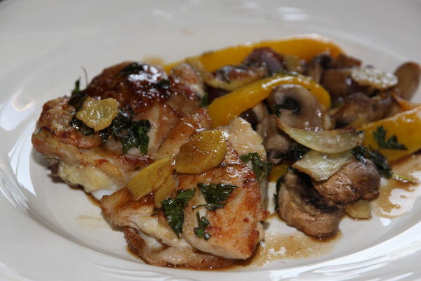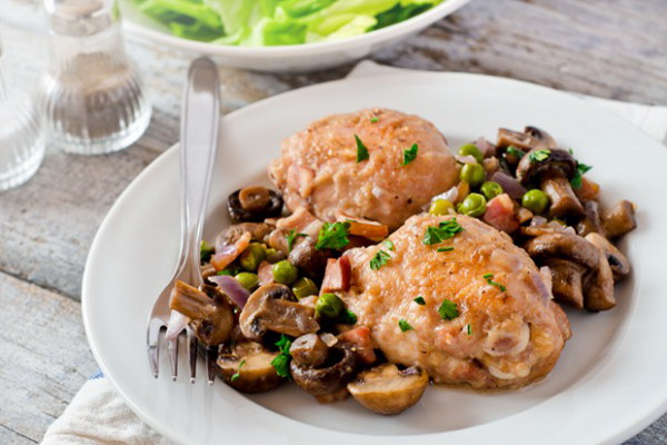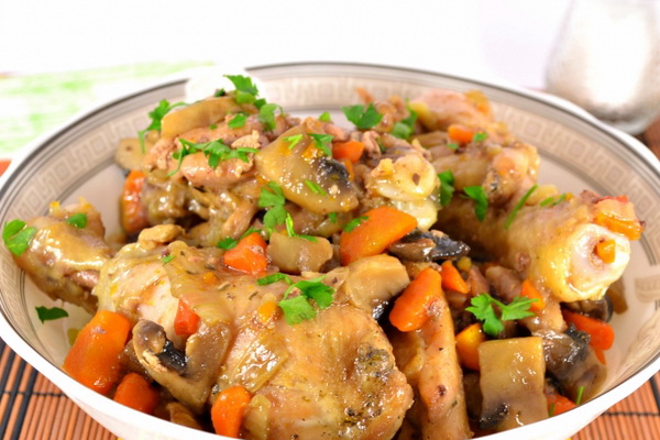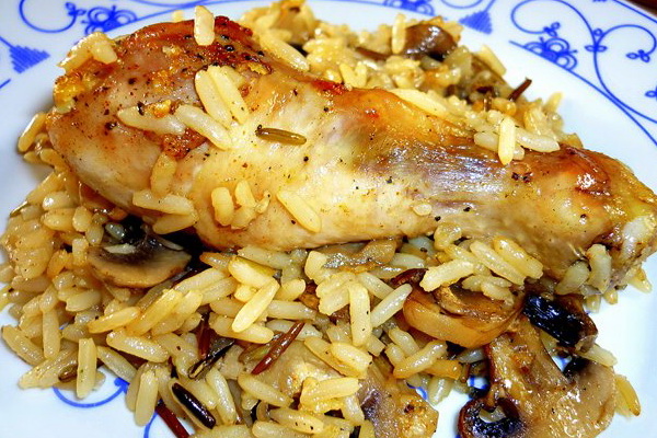 Cuisson: champignons peler et couper en tranches. Lavez la cuisse de poulet, séchez-la avec une serviette en papier ou une serviette de table, faites la bien frire de tous les côtés dans de l'huile végétale chaude, du sel et du poivre. Épluchez l'ail, passez au presse et râpez la peau sur les cuisses. Dans la graisse restante du rôtissage, ajoutez les champignons (3 minutes). Versez 2 tasses d'eau tiède, amenez à ébullition et versez le mélange de sauce, mélangez bien. Porter à nouveau à ébullition, faire bouillir un peu et verser le vin. Mettez les cuisses de poulet dans la sauce. Cuire sous le couvercle pendant 25 minutes à feu doux. Servir garni de persil. Le meilleur plat d'accompagnement est le riz bouilli avec une salade de tomates fraîches.
