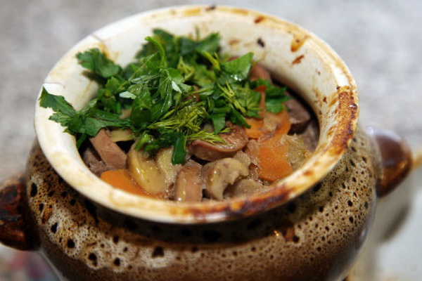 La pulpe de porc, d'agneau et de veau coupée en morceaux. Mettez la viande dans des pots en argile, graissés avec du beurre. Râpez les oignons, faites-les frire au beurre, ajoutez les champignons et faites-les frire, mettez la viande, ajoutez le sel, un peu de graines de carvi et la noix de muscade, du persil finement haché. Mettez les casseroles au four et, sans ajouter de liquide, laissez mijoter la viande à une température de 140 ° C pendant 40 minutes.