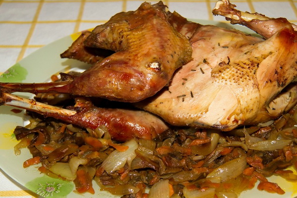 Ingrédients 1 carcasse de lapin pesant 1,5 kg., 4 oignons, 100 g. Noix pelées, 200 g. Champignons forestiers (frais), 50 g. Beurre, 100 g. Raisins, poivre, sel, herbes pour la décoration.