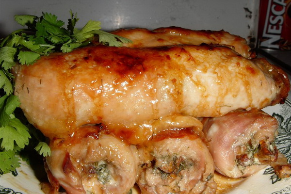 Cuisson: épluchez doucement les cuisses de poulet. Couper le poulet en dés et mélanger avec l'oeuf cru. Aux champignons et les oignons finement hachés, ajoutez le cube de Maggi broyé et faites-le frire dans du beurre. Cuire la viande hachée en mélangeant les champignons, le poulet et le fromage râpé. Farce pelure avec de la viande hachée. Après avoir mélangé la mayonnaise avec de l’ail finement haché, enrobez les cuisses de poulet et mettez-les dans un chaudron. Versez un peu d’eau ou de bouillon (pour que les cuisses de poulet soient à moitié fermées). Mettez le ragoût avec les champignons dans un chaudron au four et laissez mijoter pendant 30 minutes.