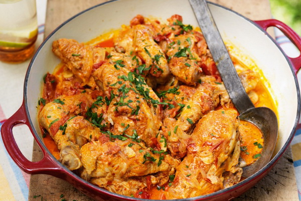 Composition. Poulet ou dinde - 600 g, beurre - 3 c. cuillères, farine - 1 cuillère à soupe. cuillère, oignon - 1 pc., carottes - 1 pc., persil - 1 racine, céleri, un peu d'ail, purée de tomates - 3 c. cuillères à l'étouffée dans leur propre jus de cèpes ou de champignons - 1 tasse de sel, bouillon de volaille - 1,5 à 2 tasses de crème sure - 2 c. cuillères, aneth, tomates - 4–5 pcs., plat d'accompagnement.