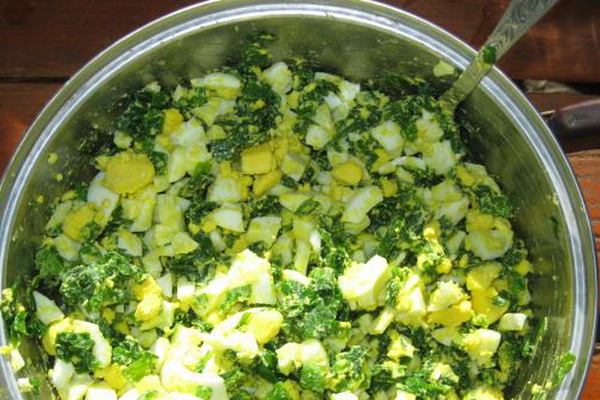 Nous lavons l'oignon et le coupons très finement, combinons avec l'oeuf.