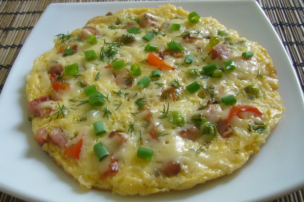 L'omelette française aux champignons est une crêpe mince, pliée en deux, farcie d'une garniture de champignons frits avec du jambon et des oignons au beurre. Ce plat inhabituel est préparé de la manière suivante:
