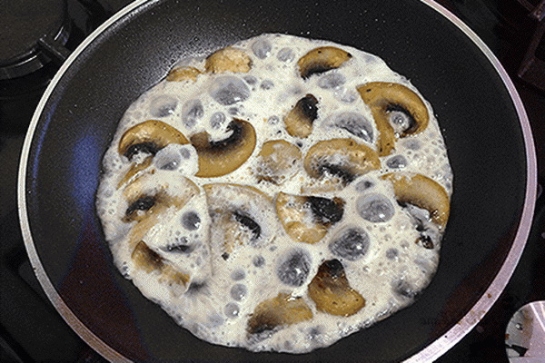 4. Versez le mélange obtenu dans une casserole garnir les champignons sautés, couvrir et cuire 5 minutes.