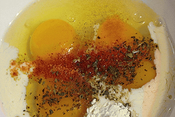 3. Combinez les œufs avec du lait, fromage râpé, herbes et sel.Bien mélanger tous ces composants pour obtenir un mélange liquide homogène.