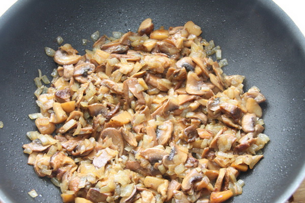 Les oignons sont coupés en cubes et combinés avec des champignons hachés, salés au goût, frits jusqu'à tendreté et mélangés à de la viande de poulet.