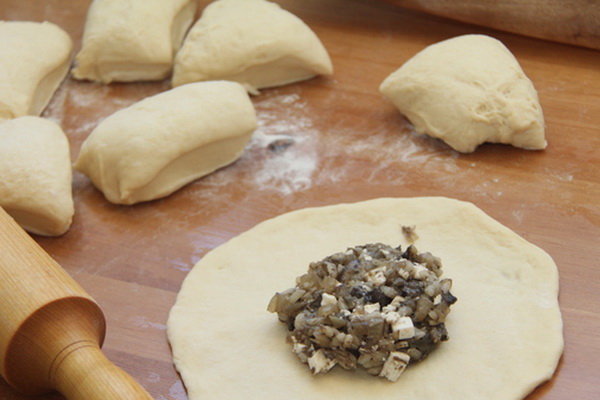 Abaisser la pâte en un gâteau, mettre la farce de champignons et de fromage au centre, relever les bords et pincer la pâte.