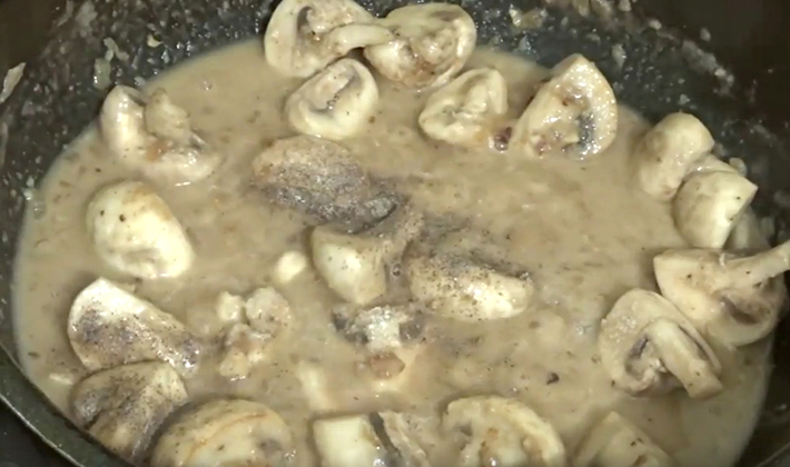 Après avoir fait frire dans une poêle jusqu'à obtenir une croûte légèrement dorée, saupoudrez de farine (pour épaissir la sauce) et versez la crème sure et la crème en remuant délicatement, ajoutez des épices au goût.