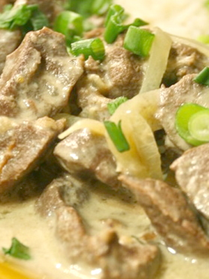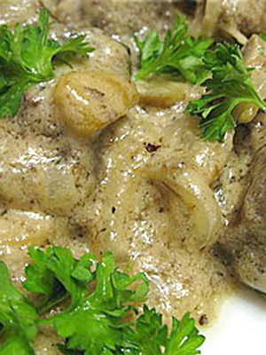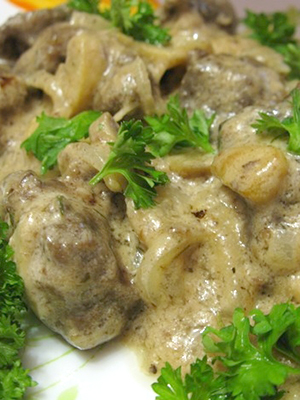 Rincez les abats, nettoyez-les de la plèvre et coupez-les en cube de 4 cm de diamètre, puis faites les cuire à feu doux pendant 25 minutes. Dans une deuxième poêle, faire revenir l'oignon et les champignons coupés en dés. Après leur préparation finale, combinez ces ingrédients dans une casserole, saupoudrez de farine et versez la crème sure. Ajouter la noix de muscade râpée, le sel, le poivre et laisser mijoter 15 minutes à feu moyen, parsemer d'herbes.