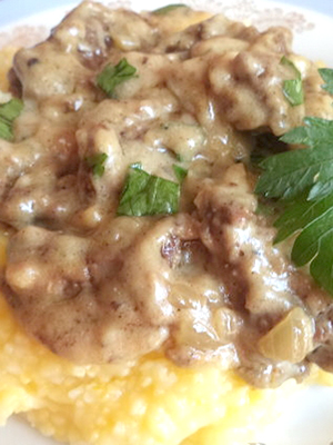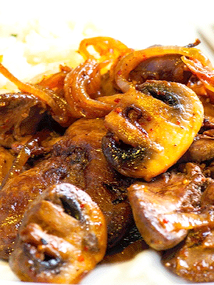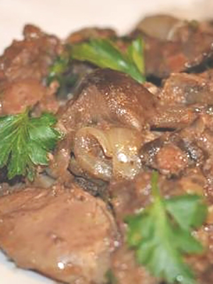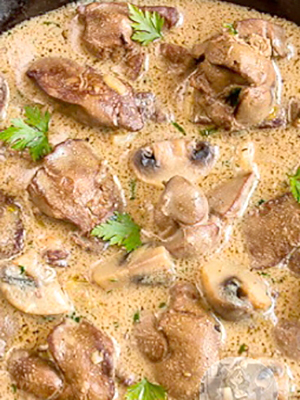 Foie de dinde cuit aux champignons dans une sauce crémeuse à la crème sure