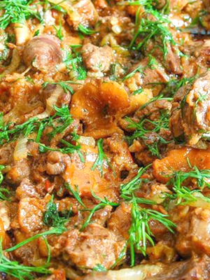 Rincer les abats dans de l’eau courante froide, les couper en tranches de 4 à 5 cm et les faire frire dans de l’huile végétale jusqu’à formation d’un jus clair. Cela prend 20-25 minutes. Ajoutez des épices à vos préférences personnelles. Épluchez et hachez les oignons dans un petit cube. Rincer les champignons, peler et couper en assiettes. Faire frire les légumes et le céleri-rave dans l'huile jusqu'à l'obtention d'une croûte légèrement dorée et mettre au foie. Dans un poêlon propre, faites frire la farine dans plusieurs cuillères à thé d'huile (farine grasse), en versant progressivement la crème sure et la crème en remuant continuellement. Une fois que la sauce bout, versez-la sur le reste des ingrédients. Mélanger, ajouter les légumes verts hachés finement et laisser mijoter à feu doux pendant 15 minutes. La gâterie est prête à enchanter et à surprendre par son arôme et son goût extraordinaires.