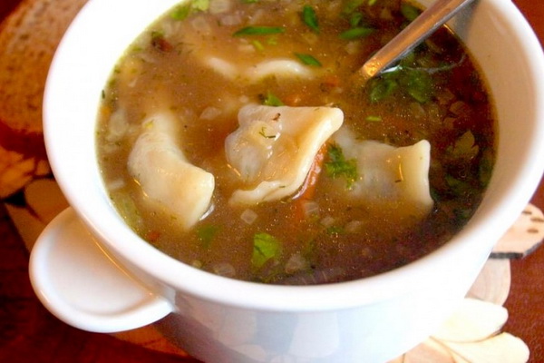 Pétrir la pâte, la rouler finement et couper les gâteaux. Sur chaque mettre une cuillère à café de viande hachée, pincer, faire bouillir dans de l'eau salée, incliner dans une passoire. Trempez les "oreilles" dans un bouillon chaud, ajoutez de la crème sure et tiède, sans porter à ébullition.