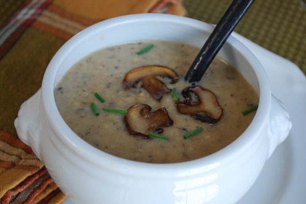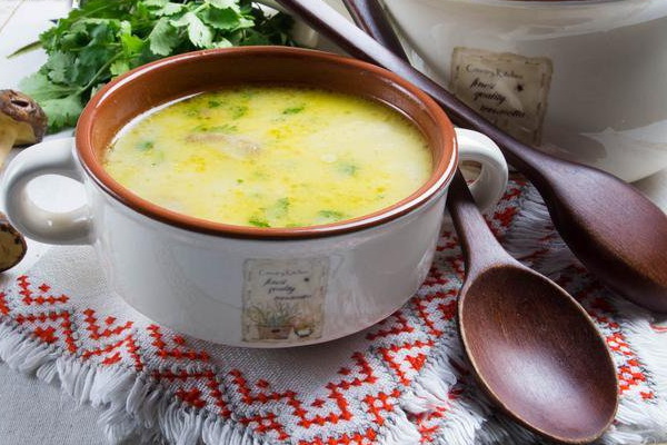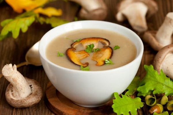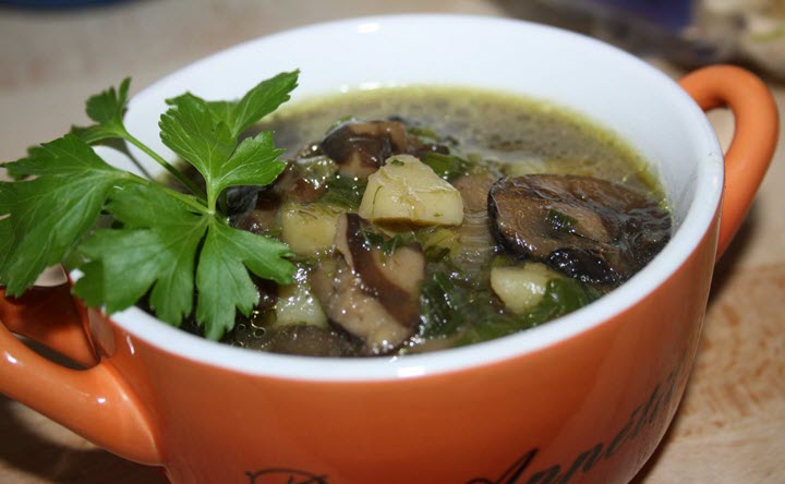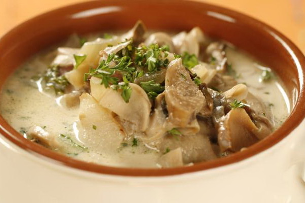 Selon cette recette, à cette soupe de champignons, vous devez ajouter de la crème sure ou de la crème avec des jaunes en vrac, non bouillante. Au moment de servir, saupoudrer de persil haché.