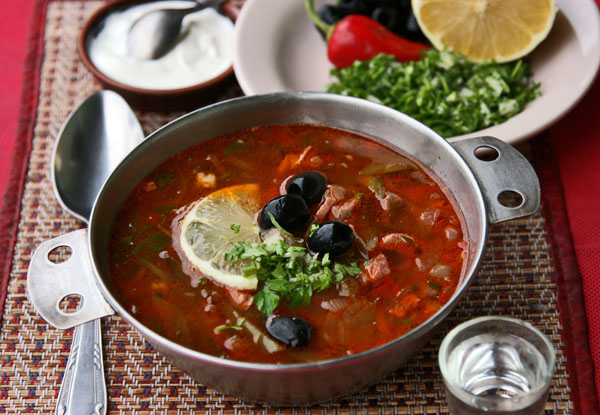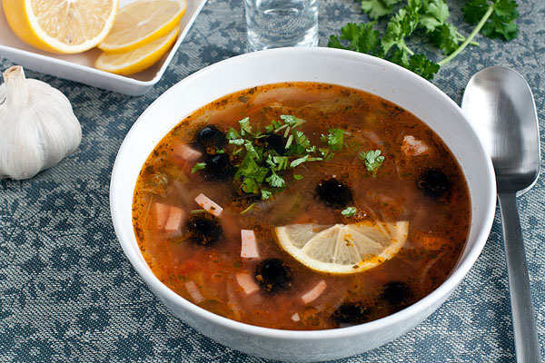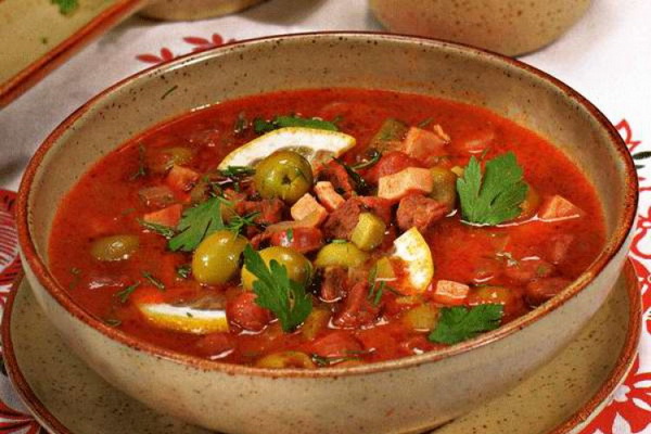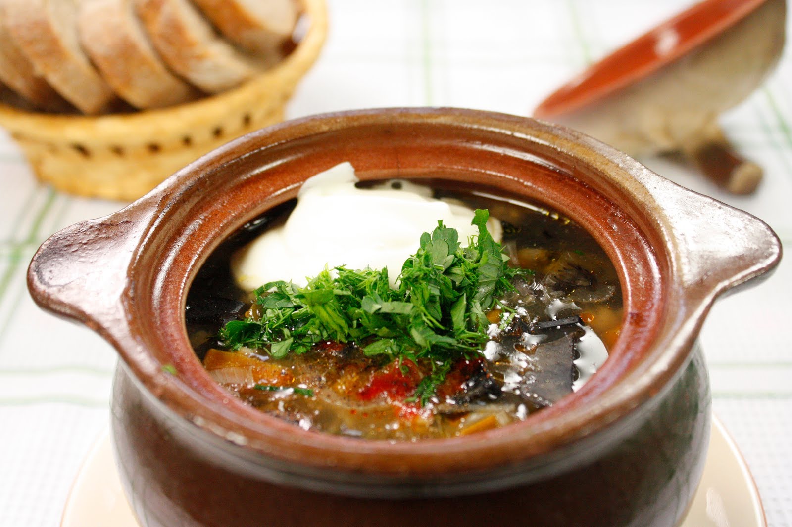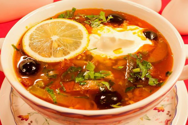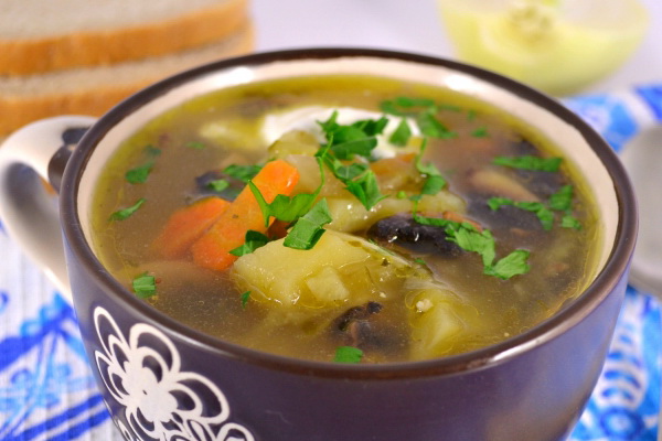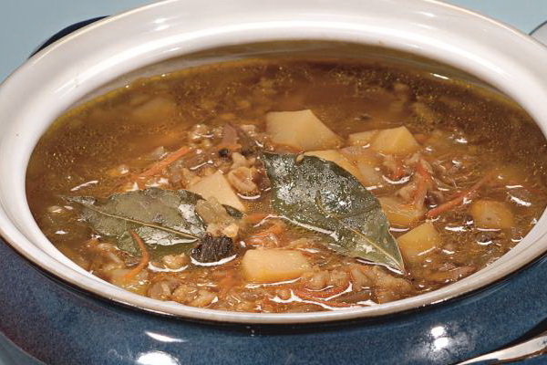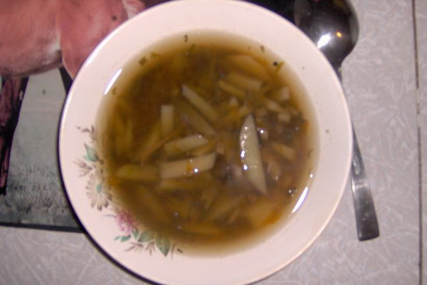Hachez et faites légèrement frire les oignons, en ajoutant la purée de tomates à la fin de la cuisson. Faire bouillir les champignons dans une petite quantité d'eau, après les avoir retirés du bouillon et rincer à l'eau froide. Mettez les champignons tranchés dans un bol, ajoutez les cornichons finement hachés (sans la peau), les oignons légèrement frits, les feuilles de laurier, les grains de poivre et assaisonnez avec du bouillon de champignons préparé à l'avance. Ajoutez la quantité requise d’eau chaude et laissez cuire 10 minutes.