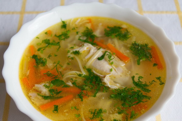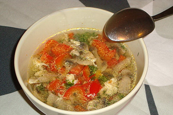 En accompagnement, mettez dans le bouillon un piano de champignons forestiers ou de truffes finement hachés et du poulet haché en lanières