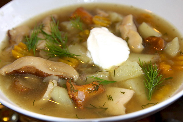 Faire revenir les tranches de champignons porcini dans l'huile, les plonger dans une casserole avec de l'eau et laisser bouillir pendant 30 minutes. Ajouter les pommes de terre en dés, la feuille de laurier et faire bouillir à nouveau pendant 20 minutes. Décorer d'un ragoût de champignons porcini à l'aneth. Servir avec de la crème sure.