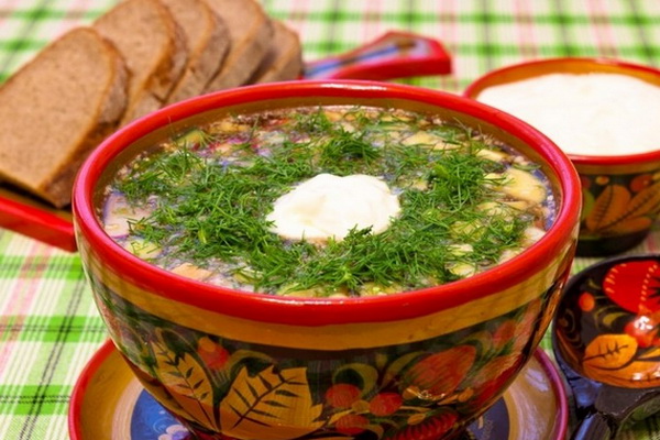 Pour cette recette, okrochka aux champignons nécessite 1,2 litre de pain, 200 g de champignons salés ou marinés, 100 g d'oignons verts, 400 g de pommes de terre, 50 g de raifort, 10 g d'aneth, 100 g de crème sure, sel.