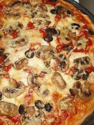 - Pizza à la viande hachée et aux champignons sur une pâte à levure