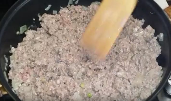 - Faites cuire 200 g de boeuf haché dans le beurre jusqu'à ce qu'il soit cuit et répartissez uniformément sur la pâte.