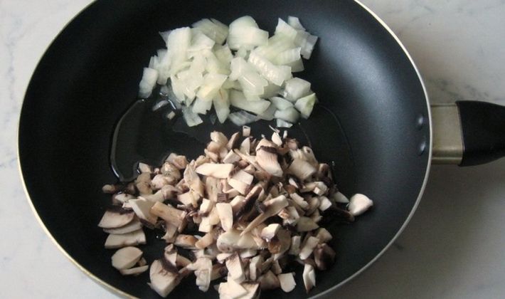 - Faites cuire l'oignon et 200-300 g de champignons frais dans une petite quantité d'huile végétale, en les ramenant à la douceur - environ 10-15 minutes. Mettez le mélange d'oignons et de champignons obtenu sur un gâteau.