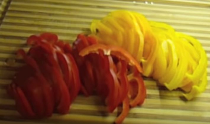 Couper une grosse tomate et un poivron en tranches et les déposer uniformément sur la surface du produit semi-fini.
