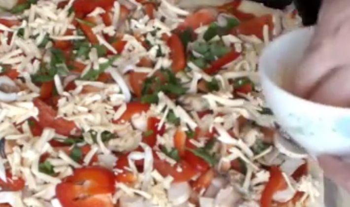 Saupoudrer tous les ingrédients avec beaucoup de 15 g d'herbes et 250 g de fromage à pâte dure. Ces composants ne peuvent pas gâcher le plat. Par conséquent, plus leur nombre est élevé, plus le goût de la pizza est riche.