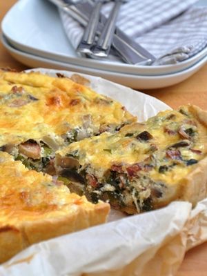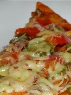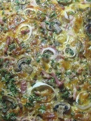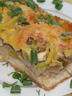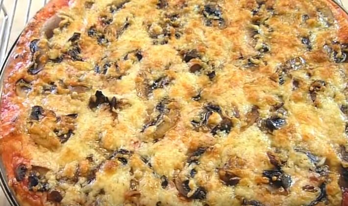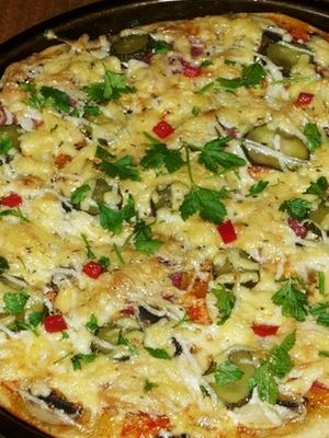 - Hachez les oignons et les champignons, faites les frire dans de l'huile végétale, salez et mettez sur le gâteau. Saupoudrer la pizza avec du concombre haché. Ajoutez du fromage râpé à la pièce et versez le tout avec un mélange d’œufs battus et du reste de la crème sure. Cuire le plat au four pendant 40 minutes.